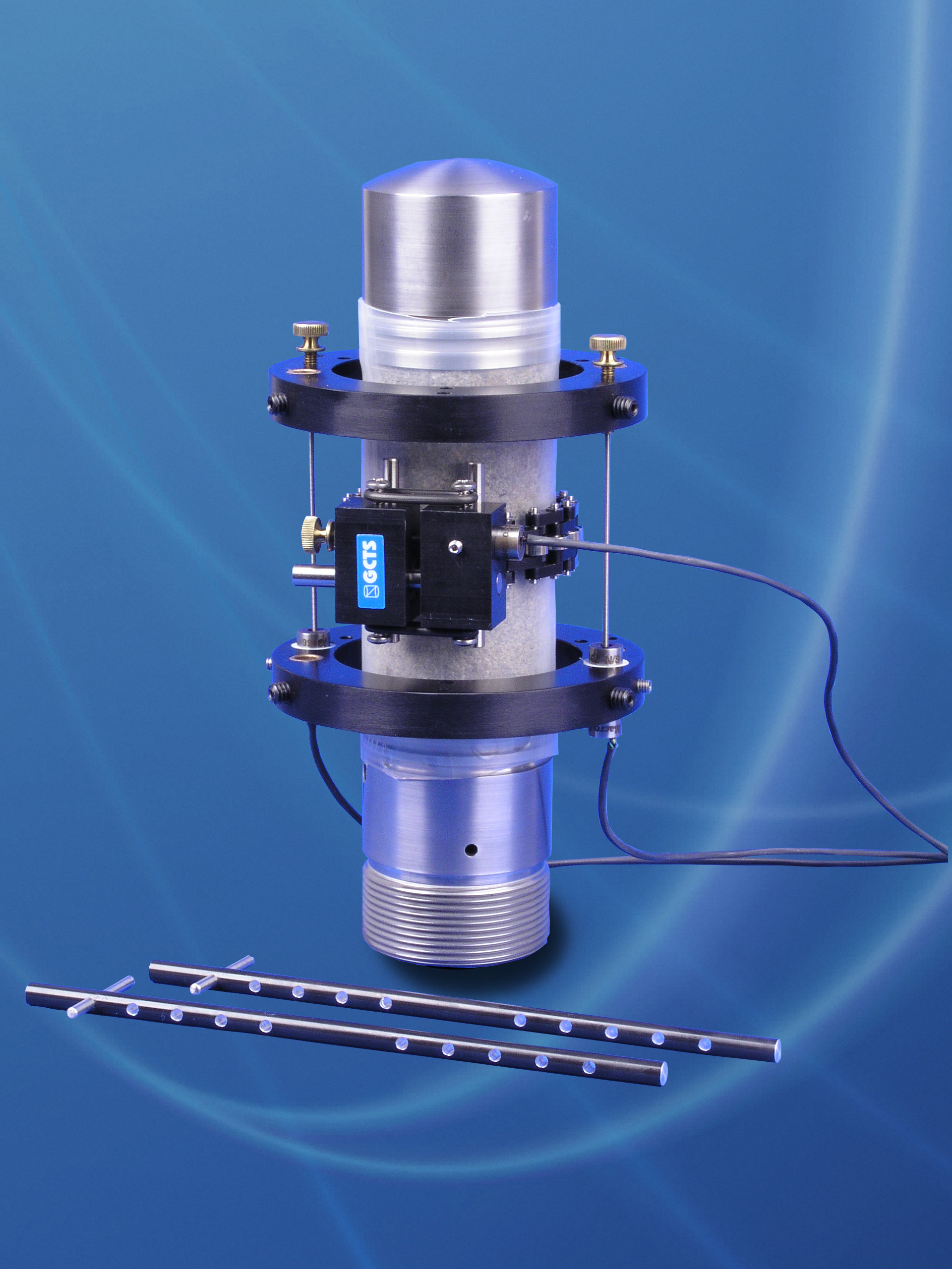 兩個軸向傳感器和一個徑向傳感器,徑向采用非延展性鏈條式設(shè)計,精確測量試樣周長平均值,相對點式結(jié)構(gòu)精度更高。巖芯直徑范圍25mm~100mm