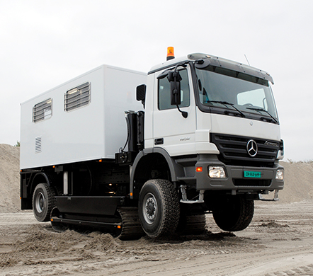 Track-Truck在其他卡車被困住的區(qū)域內(nèi)行動(dòng)自如,這要?dú)w功于他的一體化的履帶-輪胎式設(shè)計(jì)。Track-Truck在CPT卡車上混合了液壓驅(qū)動(dòng)履帶,提供了這套在松軟土上的可移動(dòng)設(shè)備。通過在操作間的操作者的遠(yuǎn)程控制,可以收起履帶,Track-Truck可以在公路上以普通卡車的速度前進(jìn)。